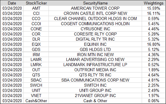 SRVR는 데이터 및 인프라와 관련된 부동산에서 수익의 85%이상을 얻고 있는 회사 포트폴리오를 보유하고 있습니다. 좀 더 구체적으로 말하면 데이터 센터 및 통신 타워와 같은 데이터의 저장, 계산 또는 전송에 사용되는 부동산을 소유하거나 관리하는 회사를 의미합니다. 일부 기초 부동산 투자 회사는 차입금이 높을 수 있으나, 그 자체는 차입금이 아니다. SRVR는 공간에서 "당첨자 선택"에 추가 화면 또는 가중치를 적용합니다. 구성 요소는 시장-캡 가중치를 적용합니다. 가장 큰 이름들은 15%로 범위가 정해져 있지만, 사람들은 아마도 그 공간을 반영하는 상위 10개의 이름들에 집중하는 것을 볼 수 있다. 전체적으로 SRVR는 좁은 주제에 대한 직접적인 노출을 제공합니다.