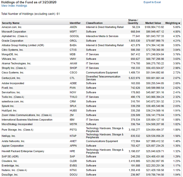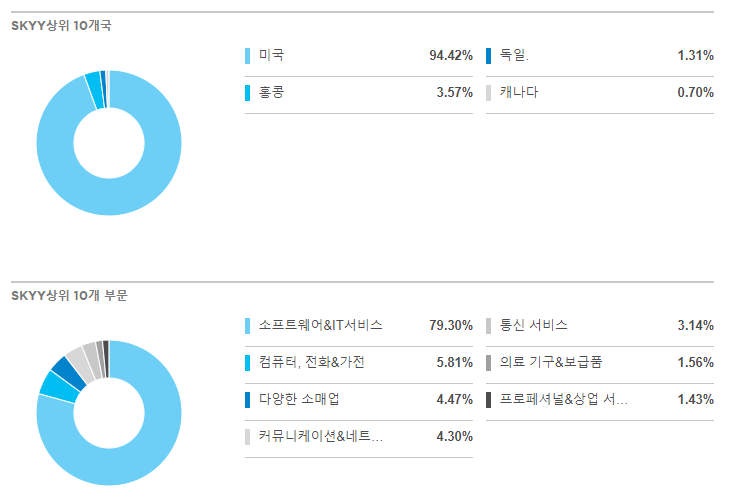 SKYY는 클라우드 컴퓨팅 산업과 관련된 기업들의 지수를 추적하고 있습니다. 주식은 하부 그룹 즉, 인프라, 플랫폼 및 소프트웨어에 의해 가중치가 부여된다.