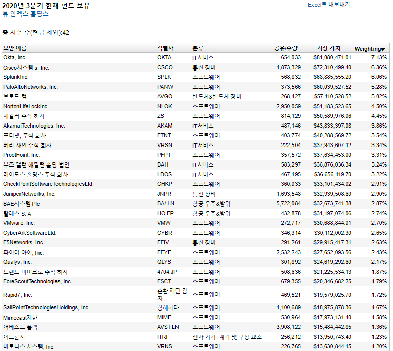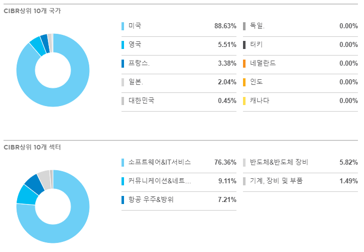 CIBR은 사이버 보안 산업에 종사하는 회사를 대상으로 하는 유동성 가중치 지수를 추적한다.
