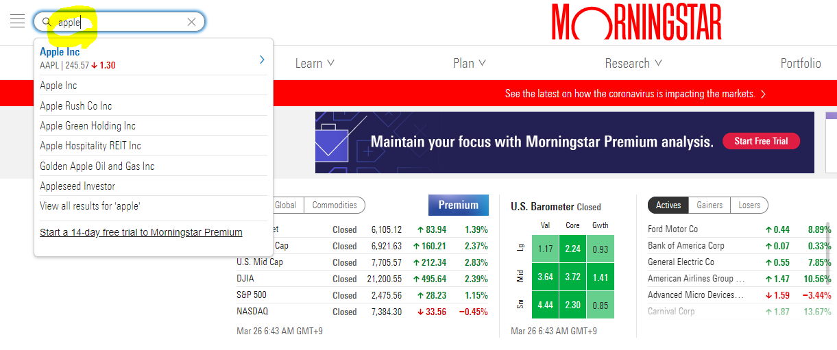 1. 모닝스타 웹사이트 접속 후, 확인하고자 하는 기업의 이름을 검색합니다.