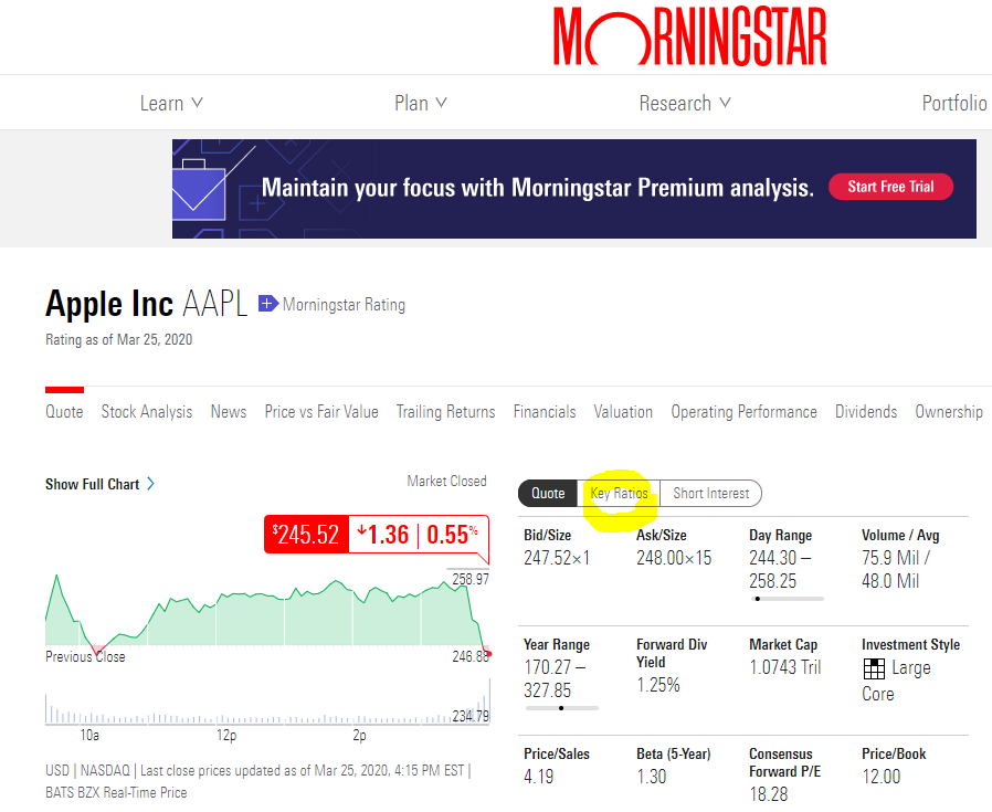 2. 검색 후, 화면 중간에 위치한 Key Ratios를 클릭합니다.