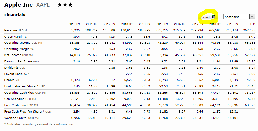 4. 그럼 10년치의 재무제표가 활성화됩니다. Export를 클릭해 엑셀으로도 확인할 수 있습니다.