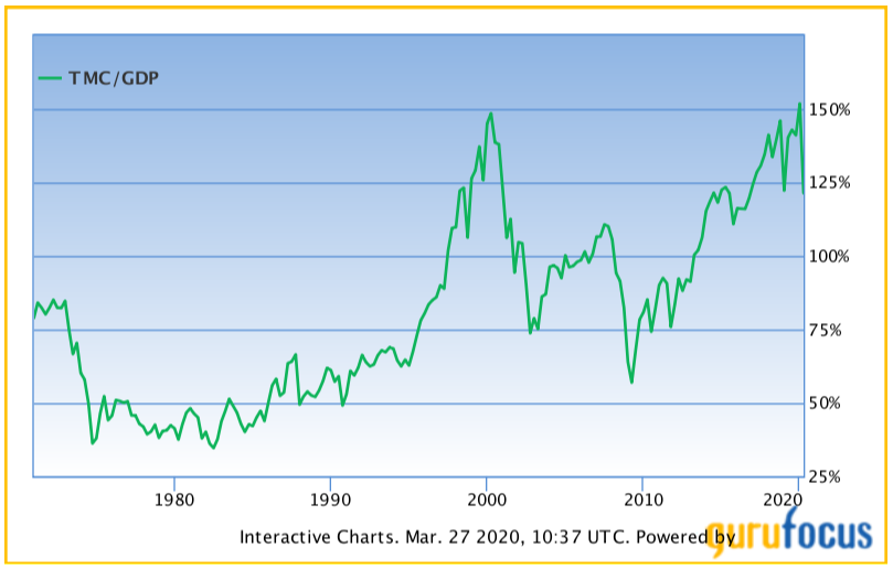 장기적으로 볼 때 주식 시장의 평가는 평균으로 되돌아간다. 높은 경상 수지 평가는 미래에 장기적인 수익이 더 낮은 것과 확실히 관련이 있다. 반면에 경상 가치가 낮을수록 장기 수익률이 높은 것과 상관 관계가 있다. 총 시장 가치는 워렌 버핏의 "최선의 단일 조치"를 대표하는 방정식인 총 시장 상한선의 GNP비율로 측정된다. 1970년 이후의 이 비율은 오른쪽의 두번째 도표에 나와 있다. Gurufocus.com은 이 비율을 매일 계산하여 업데이트합니다. 032/2727/2020현재 이 비율은 121.4%입니다.