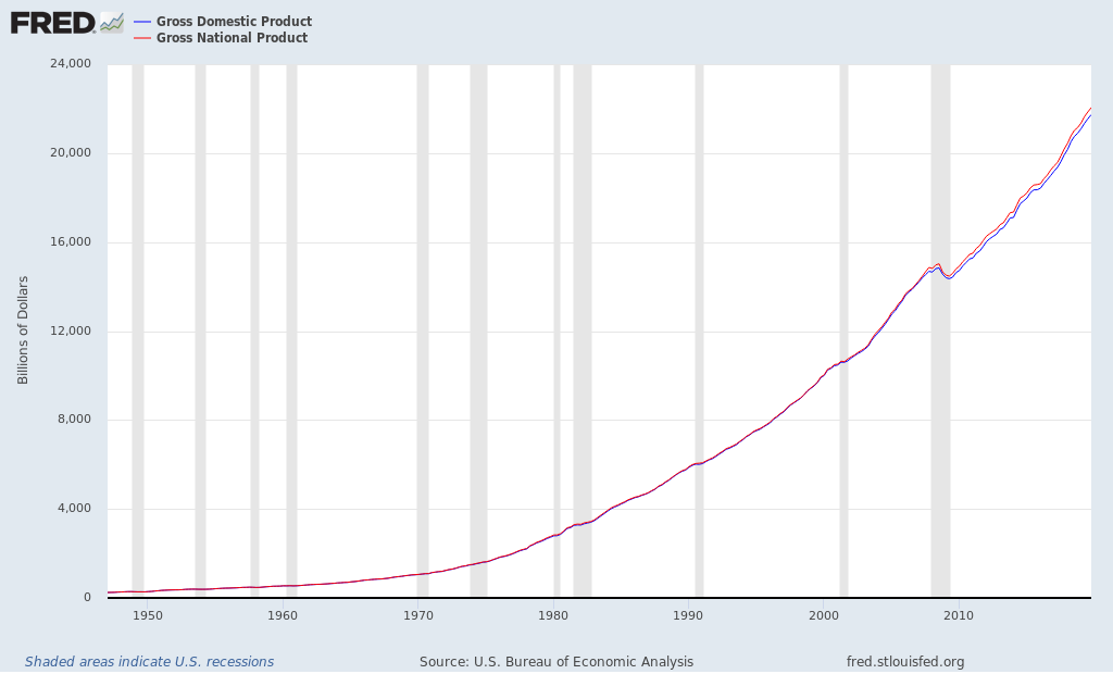 신속한 리프레시(Greenback덕분에) : GDP는 "한 국가의 경계 내에서 생산된 상품과 서비스의 총 시장 가치"입니다. "GDP는 한 국가의 거주자들이 해외에 살고 있다고 해도 그들이 생산한 재화와 용역의 총 시장 가치이다. 미국 기업들이 국제적으로 사업 규모를 늘리고 있기 때문에 차이가 중요하지만, GNP와 GDP의 실질적인 차이는 세인트 루이스 연방 준비 제도 이사회(St.LouisDemonstrators)의 이 차트에 나와 있는 것처럼 미미하다.
