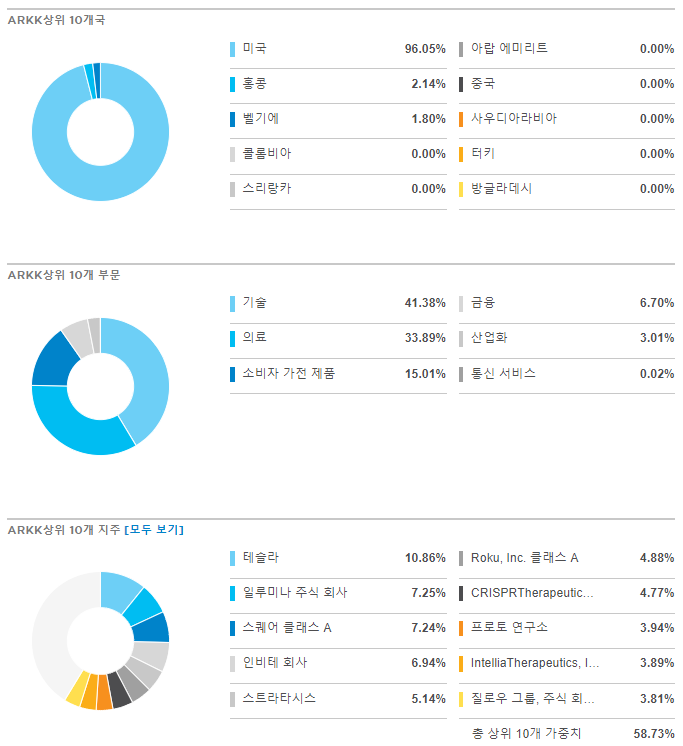 최근에 출시된 ARKK는 "위의 모든"접근 방식을 따른다. 이 기금은 ARK가 발행한 세가지 다른 주제 자금인 게놈 혁명, 산업 혁신, 웹 x1.0의 전략을 결합한 것이다. ARKK는 테슬라 모터스, 직관적 수술, 알리바바 같은 헤드 라인에서 뜯어 온 절단된 형태로 가득 차 있다. 하지만, 이 기금의 위임장은 디즈니와 찰스 슈워브를 포함한 새로운 기술로부터 이익을 얻을 수 있는 거의 모든 회사들을 포함할 정도로 광범위해 보인다. ARKK가 저렴하다고 할 수는 없지만, 다른 틈새 ETF와 동등하다.