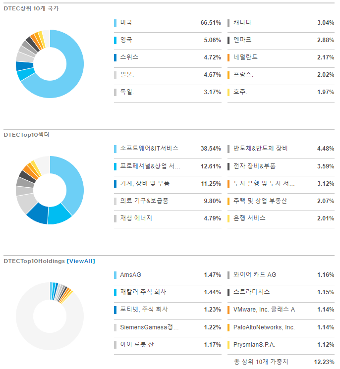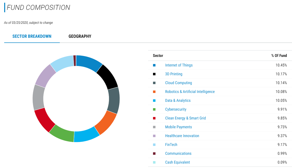 DTEC는 기술 부문 내에서 10가지 주제를 다루며, 의료 혁신, 사물의 인터넷, 청정 에너지 및 스마트 그리드, 클라우드 컴퓨팅, 데이터 및 분석, 핀테크, 로봇 및 인공 지능, 사이버 보안, 3D프린팅, 모바일 결제 등을 중점적으로 다룹니다. 이 지수는 타당성 모델에 따라 각 주제 영역에서 10개의 회사를 선택하고 각 보안에 동일한 가중치를 부여하여 각 주제와 회사에 동일한 표현을 효과적으로 부여한다. 이 펀드는 특정 지역에만 국한되지 않으며 선진국과 신흥 시장에서 모두 회사를 선택할 수 있다. 그 펀드는 다른 주제와 부문 펀드에 비해 상당히 높은 가격이다.