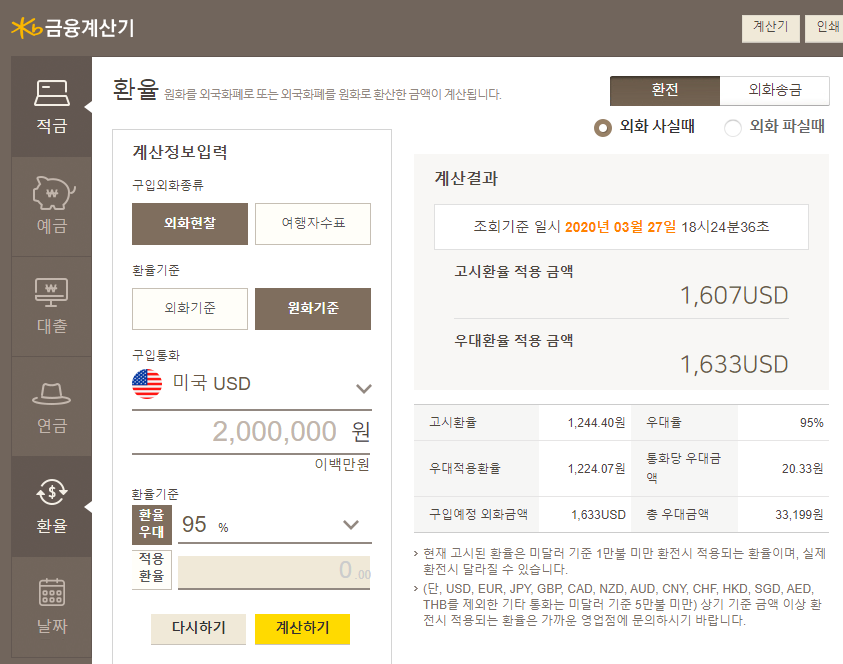 환율우대 95%일때, 1,633 - 1,607 = 26$