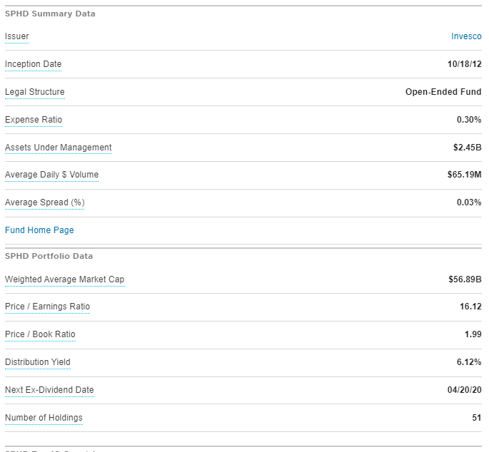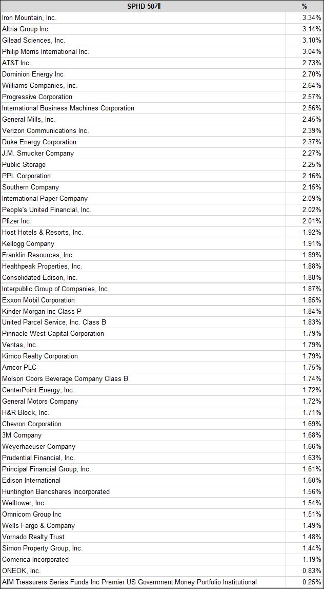 SPHD는 S&P500의 75개 종목 중에서 선택된 가장 적은 50개의 이름을 포함한 분할 가중치 지수를 추적한다.