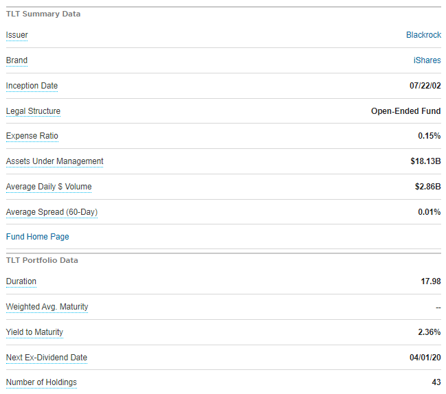 TLT는 남은 20년 이상의 만기를 가진 미국 재무부에 의해 발행된 부채의 시장 가중치 지수를 추적한다.