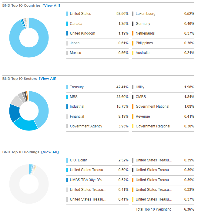 BND는 적어도 1년 이상의 만기를 가진 미국 달러 표시, 투자 등급, 과세 대상, 고정 수익 증권의 광범위하고 시장 가치가 높은 지수를 추적한다.
